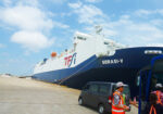 パティンバン港に寄港した自動車運搬船(左)と日本企業により製造された車両(右)