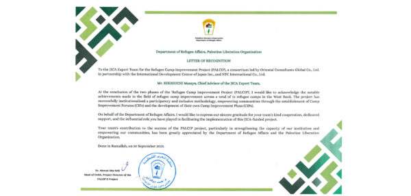 「パレスチナ難民キャンプ改善プロジェクト」感謝状授与